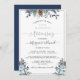 Convite de aniversário de casamento de 25 anos (ou outro) requintado com detalhes prateados e detalhes florais em azul-navy, azul claro e cinza pintados à mão em aquarela. Possibilidade de alterar o número do aniversário para atender às suas necessidades. Uso de tipografia moderna e elegante em Script e bloco. Verso em tom azul-navy elegante e detalhe floral central cativante. Produtos coordenados disponíveis. Parte da nossa coleção de casamento e eventos "Montanhas Azuis Rústicas".