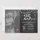 Aniversário de 25 anos de casamento com foto personalizada. Convite preto e prata em quadro-negro. Vigésimo quinto aniversário de casamento. Fundo de diamante brilhante preto e prata. Confetes de prata. Aniversário adulto. Festa de aniversário de mulher ou homem. Para personalização adicional, clique no botão "Personalize" e use nossa ferramenta de design para modificar este modelo.