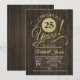 Convite de aniversário de 25 anos rústico com padrão de madeira marrom escuro e brilho dourado falso. Um brindes a 25 anos! Perfeito para uma celebração elegante.