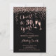 Convite para aniversário de 30 anos. Até 30 Anos! Design elegante em ouro preto e rosa. Apresenta óculos de champanhe, fonte de script e confetti. Perfeito para na moda e trigésima festa de aniversário. Personalize com seus próprios detalhes. Pode ser personalizado para mostrar qualquer idade.