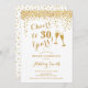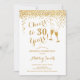Convite para aniversário de 30 anos. Até 30 Anos! Design elegante em branco e ouro. Apresenta óculos de champanhe, fonte de script e confetti. Perfeito para na moda e trigésima festa de aniversário. Personalize com seus próprios detalhes. Pode ser personalizado para mostrar qualquer idade.