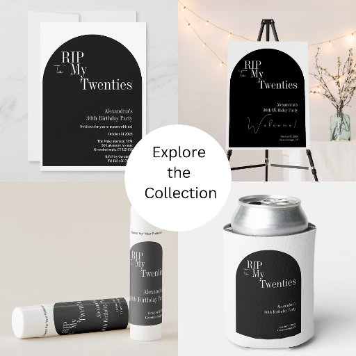 Este é um estilo aniversário de 30 anos gótico, design de festa RIP 20s. Este simples design RIP 20s, está em preto e branco clássico com tipografia na moda e forma headstone/gravestone. O modelo está configurado para que você simplesmente adicione seus detalhes de festa de aniversário de nome. A design de tipografia RIP também é repetida no verso. Perfeito para um legal e divertido, RIP 20s temático, aniversário de 30 anos. Para personalizar, basta usar o botão personalizar para adicionar seu nome e detalhes da festa, aqui você também pode alterar a idade ou o resto do texto se quiser. Verifique a ferramenta de edição de design para alterar a cor ou a fonte. Se você precisar de ajuda com personalização, produtos correspondentes ou para um design personalizado, entre em contato comigo via chat zazzle.
