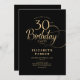 Convite de festas de aniversário de 30 anos de ouro preto elegante. Design elegante com fonte de script de tipografia. Trendy convida o cartão perfeito para uma comemoração de na moda. Pode ser personalizado para qualquer idade. Impressos convites Zazzle ou modelo de impressão digital instantânea para download.