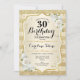 Convite para aniversário de 30 anos. Design floral elegante em ouro e branco. Apresenta fitas de ouro com brilho sujo, fontes de na moda de rosas brancas e confetti. Perfeito para uma festa de aniversário de vidro.