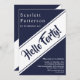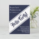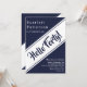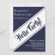 Este elegante convite de aniversário azul e branco é perfeito para um aniversário moderno. o simples design apresenta uma caligrafia branca elegante num fundo azul marinho.
