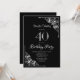 Um convite de festas aniversário de 40 anos preto e branco com cantos diagonais de rendas do ornamentado para enquadrar o texto branco.