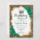 Convite de festas aniversário de 40 anos. Elegante design verde-esmeralda floral com ouro e rosas brilhantes falsos. Apresenta a impressão e a letra de um animal de chita leopardo. Perfeito para uma comemoração de dia das mulheres na moda. Pode ser personalizado para qualquer idade! Impressos convites Zazzle ou modelo de impressão digital instantânea para download.