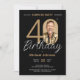 Foto Elegante, Dourada, Convite para aniversário de 40 anos de Surpresa Negra. Elevem a sua celebração de marco com um design de convite que epitomiza a elegância subestimada e o minimalismo quic. Nosso tema preto e ouro expele sofisticação, criando uma atmosfera refinada para seu dia especial. O recurso de foto personalizado adiciona um toque personalizado, garantindo que cada convite seja uma recordação única e apreciada. A simplicidade do design melhora seu apelo geral, fazer uma afirmação ousada através de linhas limpas e uma mistura saborosa de sotaques de preto e ouro. Junte-se a nós para uma celebração onde cada detalhe é cuidadosamente curado para refletir a beleza encontrada na simplicidade, criando memórias que são tão eternos quanto a própria ocasião.