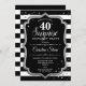 Convite para aniversário de 40 anos surpresa. Design clássico com faixas pretas e brancas, fonte de script e prata brilhante. Perfeito para uma bolsa mensageifesta de aniversario elegante. Pode ser personalizado para mostrar qualquer idade. Envie-me uma mensagem se precisar de mais personalização.