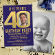 Convite de festas de aniversário de 40 anos de modelo de foto dourado e azul escura gráfico simples e preto preto preto preto preto preto preto e branco. Personalize este convite de aniversário milestone com seus próprios detalhes de evento de festa de aniversário, e fotos do seu aniversariante ou garota no centro de 0 em 40 e um cheio tirou fotos no verso, excelente para uma oportunidade de fotos e agora. Outras cores de anos e itens correspondentes estão disponíveis. © Original design por Sarah Trett para www.mylittleeden.com no Zazzle.