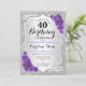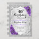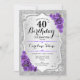 Convite para aniversário de 40 anos. Design floral elegante em prata e roxo. Apresenta faixas de prata com brilho sujo, fontes de script na moda de rosa de de roxo e confetti. Perfeito para uma festa de aniversário de vidro.