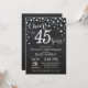 Convite de Aniversário de 45 anos de Casamento Quadro Negro e Prata. Quarenta e cinco Anos de Casamento. Fundo de Diamante Brilhante Preto e Prata. Confetes Prateados. Aniversário de Adulto. Festa de Aniversário de Mulher ou Homem. Para personalização adicional, clique no botão "Personalize" e use nossa ferramenta de design para modificar este modelo.