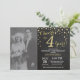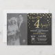 Aniversário de 4 anos de casamento com foto personalizada. Convite em quadro de giz preto e dourado. Quarto aniversário de casamento. Fundo de diamante brilhante em quadro de giz preto e dourado. Confetes dourados. Aniversário adulto. Festa de aniversário masculina ou feminina. Para personalização adicional, clique no botão "Personalize" e use nossa ferramenta de design para modificar este modelo.