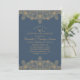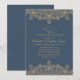 Convites Elegantes de Aniversário de 50 anos de Casamento Azul Marinho com Visual Dourado. Personalizados com os detalhes da sua celebração. Apresentam renda com visual dourado, tipografia em um fundo azul marinho. Se desejar, você pode facilmente alterar as cores do fundo e do texto. Este convite de aniversário de casamento foi desenhado por http://www.superdazzle.com