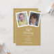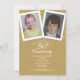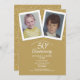 Personalize com suas fotos de infância favoritas e as informações do seu aniversário de cinquenta anos em tipografia dourada elegante. O verso apresenta corações elegantes em confete sobre um fundo dourado. Criado por Thisisnotme©