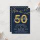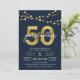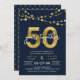 Convite de aniversário de 50 anos elegante com cordões de luz e "50" em dourado falso com "anos juntos" em branco sobre um fundo azul escuro. O cartão inclui um verso com padrão correspondente. Confira itens correspondentes, como adesivos e selos, aqui https://www.zazzle.com/collections/strings_of_lights_faux_gold_celebration_collection-119311942951401241?rf=238364477188679314
