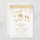 Convite de aniversário de casamento de 50 anos dourado. Parabéns por 50 anos! Design elegante em branco e dourado. Apresenta taças de champanhe, fonte manuscrita e confetes. Perfeito para uma celebração sofisticada de 50 anos de casamento. Convites Zazzle impressos ou modelo digital para download instantâneo. Pode ser personalizado para mostrar qualquer ano! Personalize com seus próprios detalhes.