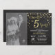 Aniversário de 5 anos de casamento com foto personalizada. Convite quadro de giz preto e dourado. Quinto aniversário de casamento. Fundo de diamante brilhante quadro de giz preto e dourado. Confetes dourados. Aniversário adulto. Festa de aniversário masculina ou feminina. Para personalização adicional, clique no botão "Personalize" e use nossa ferramenta de design para modificar este modelo.