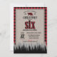 Fundo de xadrez de búfalo vermelho super fofo e moderno com elementos rústicos e country encantadores, como um urso, machados de lenhador cruzados e fontes divertidas e populares para seus convites de festa de aniversário únicos.
