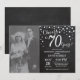 Aniversário de 70 anos de casamento com foto personalizada. Convite de quadro negro e prata. Aniversário de Setenta anos de Casamento. Fundo de diamante brilhante preto e prata. Confetes prateados. Aniversário de adulto. Festa de aniversário para homem ou mulher. Para personalização adicional, clique no botão "Personalize" e use nossa ferramenta de design para modificar este modelo.
