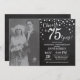 Aniversário de 75 anos de casamento com foto personalizada. Convite preto e prata em quadro-negro. Aniversário de setenta e cinco anos de casamento. Fundo de diamante brilhante preto e prata. Confetes prateados. Aniversário adulto. Festa de aniversário para homem ou mulher. Para personalização adicional, clique no botão "Personalizar" e use nossa ferramenta de design para modificar este modelo.