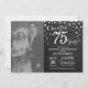 Aniversário de 75 anos de casamento com foto personalizada. Convite Preto e Prata em Quadro. Aniversário de Setenta e Cinco anos de Casamento. Fundo de Diamante Preto e Prata com Brilho. Confetes Prata. Aniversário de Adulto. Festa de Aniversário de Homem ou Mulher. Para personalização adicional, clique no botão "Personalizar" e use nossa ferramenta de design para modificar este modelo.