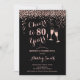 Convite de aniversário de 80. Saúde Para 80 Anos! Design elegante em ouro preto e rosa. Apresenta óculos de champanhe, fonte de script e confetti. Perfeito para uma festa de aniversário na moda oitenta. Personalize com seus próprios detalhes. Pode ser personalizado para mostrar qualquer idade.