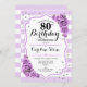 Convite de aniversário de 80. Design lilás de lavanda branca elegante com falso brilho. Listras prateadas e brancas com rosas roxas. Perfeito para uma elegante festa de aniversário oitenta.