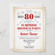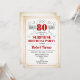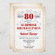 Convite de aniversário para 80 de surpresa para homens ou mulheres. Retro design em vermelho, preto e branco com fundo cremoso vintage. Apresenta fonte de tipografia na moda. Saúde para 80 anos! Também pode ser personalizado em qualquer ano. Perfeito para uma festa de 1º dia de na moda adulto.