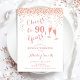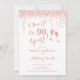 Convite de aniversário de 90. Saúde Para 90 Anos! Design elegante em branco e rosa. Apresenta óculos de champanhe, fonte de script e confetti. Perfeito para uma na moda 90 festa de aniversário. Personalize com seus próprios detalhes. Pode ser personalizado para mostrar qualquer idade.