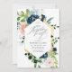 Convide seus convidados para a festa de aniversário de 90 anos com estilo com este elegante convite de aniversário floral personalizado, apresentando rosas de aquarela cor-de-rosa e azul-marinho pintadas à mão com folhagens e letra moderna preta. Personalize todos os detalhes da sua festa com tipografia preta. O verso do cartão tem um padrão de rosas de aquarela correspondentes. Desenhado por Susan Coffey.