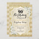 Convite de aniversário de 90. Design elegante em ouro e branco. Apresenta fitas de ouro com brilho sujo, fontes de na moda de rosas brancas e confetti. Perfeito para uma festa de aniversário de vidro.