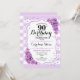 Convite de aniversário de 90. Design púrpura branca elegante com brilho sujo. Listras prateadas e brancas com rosas cor-de-rosa. Perfeito para uma elegante festa de aniversário 90.