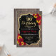 Convite de Aniversário para 90 Russo. Design elegante com ouro brilhante falso e padrão de madeira castanha escura. Possui girassóis e rosas. Perfeito para uma elegante festa de aniversário de campo ou jardim.