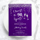 Convite de aniversário de 90. Saúde Para 90 Anos! Design elegante em roxo, branco e prata. Apresenta óculos de champanhe, fonte de script e confete prateado brilhante. Perfeito para uma na moda 90 festa de aniversário. Personalize com seus próprios detalhes. Pode ser personalizado para mostrar qualquer idade.