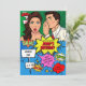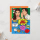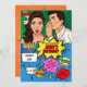 Um convite de aniversário divertido design a Pop Art / estilo cômico com cores ousadas e brilhantes e um homem sussurrando em uma orelha feminina.