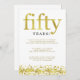 Este convite de festa de aniversário de cinquenta anos de casamento elegante diz "cinquenta" em texto de ouro falso e tem uma borda de confetes de ouro falso na parte inferior.