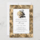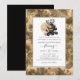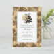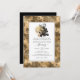 Convite de casamento com rosas pretas e douradas e um fundo de damasco vintage em foil falso cintilante.