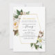 Convite de aniversário de casamento de 50 anos com pintura em aquarela featuring peônias rosa, ervas silvestres, algodão e lírios com moldura geométrica dourada personalizável para os detalhes do seu evento.
