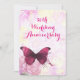 Um convite de aniversário de casamento sofisticado e elegante. O design do convite é uma linda borboleta pintada de roxo. Assentado sobre um fundo delicado que tem uma textura de aquarela única e criativa com flores desbotadas românticas em rosa e amarelo. Com um logotipo antigo tenuamente visível na parte inferior para dar um charme vintage