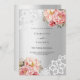Para um elegante e romântico aniversário de 25. Um fundo com aspecto fino prateado decorado com flores, rosas e rendas brancas cor-de-rosa. Personalize e adicione seus nomes e detalhes.