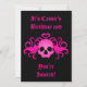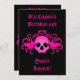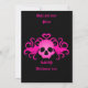 Convites adoráveis em preto com uma caveira alada com presas rosa quente com um coração no topo impresso neles. Adicione seus detalhes.