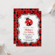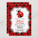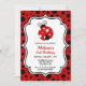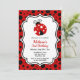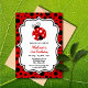 Estes convites de festas de aniversário bonitos apresentam uma joaninha fofa e uma tipografia de tendências em um fundo de bolinhas preto e vermelho. Personalize os convites de festa de aniversário adicionando o nome, a idade e os detalhes da festa do seu filho.