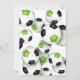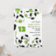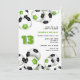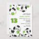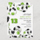 Este convite de festas de tema de futebol bonito apresenta clusters de bolas de futebol brancas, verdes, pretas e brancas brilhantes nas bordas superior e inferior na frente e um cluster de solteiros que cobre a parte posterior do convite - personalize os detalhes da festa em um fundo branco - por katz_d_zynes