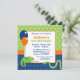 Crianças bonitas repicam convites de festas de aniversários. Design apresenta balões de festa, camaleão e cobra, com sotaque de bolinhas. Combinação de cor tradicional de verde, azul e laranja. Gráficos por www.jwillustrations.com