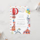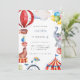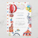 Concurso de aniversário moderno de circo para QUALQUER IDADE! Este convite mostra animais de circo bonitos, balões de ar, doces, fitas, bandeiras de bundas festivas, confete colorido e muito mais.