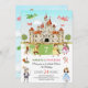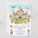 Um Convite de aniversário de Conto de Fada e Princesa Crianças. A cena da aquarela mostra dragões voando ao redor do grande castelo, enquanto cavaleiros e princesas bonito posam na grama. Personalize adicionando seu evento de cheio e os detalhes de contato.