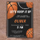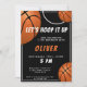Convite para Aniversário de criança de esporte de basquetebol. O design tem uma mensagem divertida "Vamos para cima" e bolas de basquete em um fundo preto. Adicione suas informações.