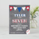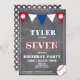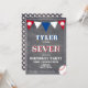 Convite para Aniversários de criança de baseball em placas de futebol. Cartão de festa de aniversário de beisebol bonito. O design tem bolas de beisebol e bandeiras de bunting em cores vermelhas, brancas e azuis em fundo de quadro. Personalize este convite de aniversário com o nome, a idade e personalize todos os dados do convite. Excelente como convite de aniversário para um garoto que ama beisebol e esportes.