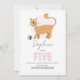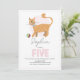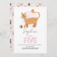 Um belo convite para aniversários de criança para meninas que apresentam um gato de mesa gengibre com uma bola rosa na frente e espaço para personalização. O dorso mostra um padrão de gatos todo-o-terreno para charme extra. Projetado como um convite para o quinto aniversário, mas fácil de personalizar para qualquer idade. Perfeito para uma festa de gatinho ou gatinho.